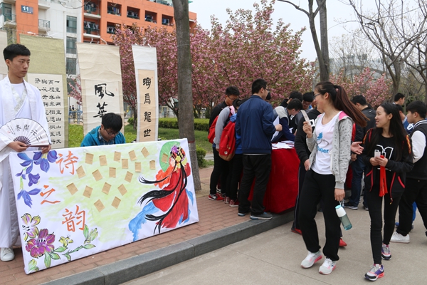 活动现场热闹非凡,自动化1501班同学邀请过往的大学生参与填诗活动,并给填对诗词的参与者送上自制的精美书签。由于诗词并不常用于日常生活当中,一些参与的同学都只能口头上说出诗词的大概内容。“故园东望路漫漫,双袖龙钟……”一个同学挠着头拼命的回忆着,面对各式各样精美的奖品,这位同学始终不肯放弃,最终还是未能写出正确答案。作为鼓励,该同学也获得了自动化1501班送出的青花瓷书签一枚,这位同学拿着书签不禁慨叹自己以后要尽量多的涉猎中国文学。活动还设有趣味书法比赛,或方或斜的毛笔字,透露出每一位参赛同学不同文字功底。活动中,同学们还纷纷与自动化1501同学扮演的古装诗人合影留念。