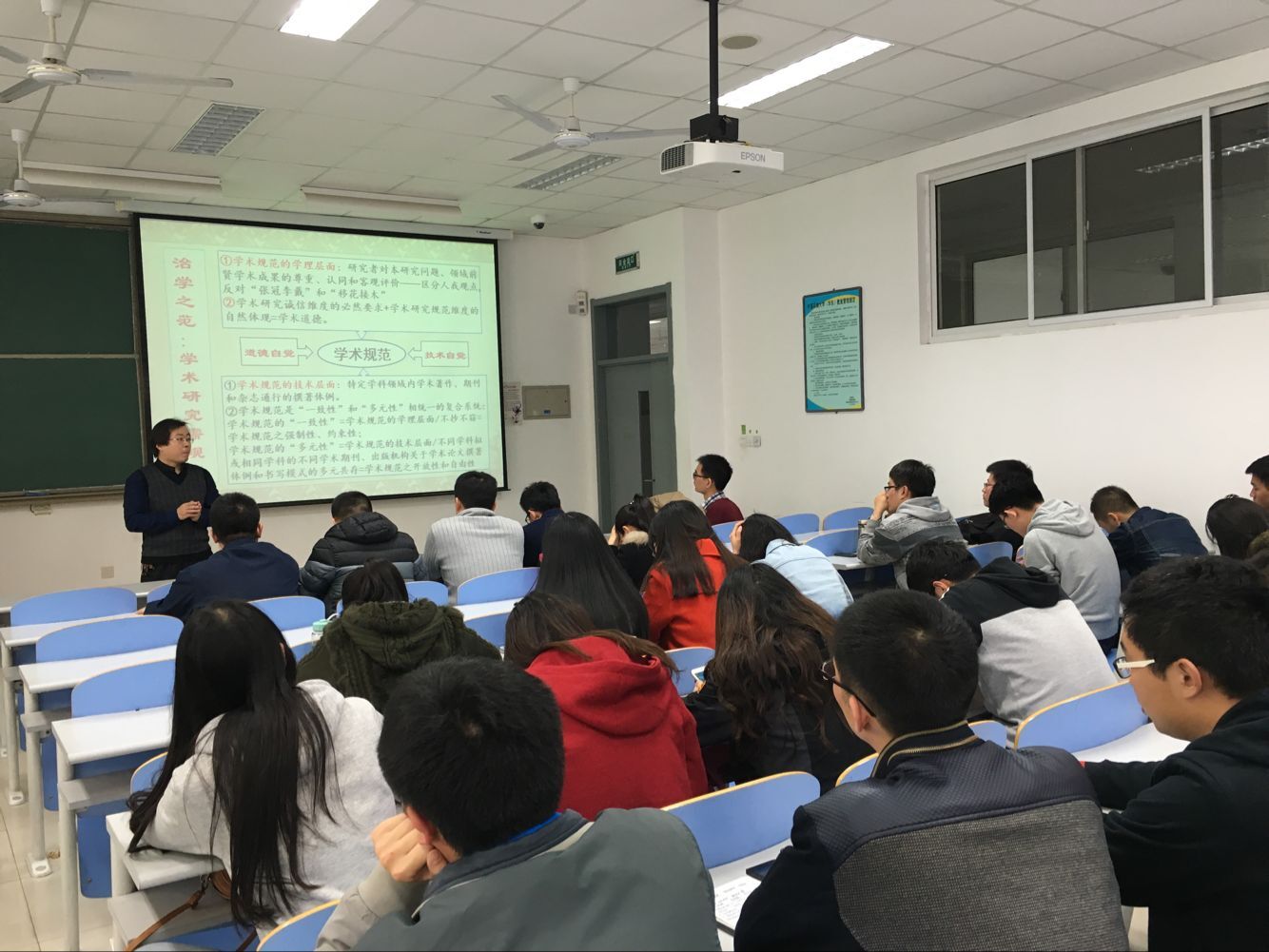 讲座一开始,张老师通过向大家提问“何为研究生以及研究生何为?”这个问题,引起大家对研究生学习以及学术问题的思考。进而,张老师通过对学术研究的“诚、新、范”进行了深入的解读。学术研究当诚信,这是立学之本;学术研究要创新,这是为学之命;学术研究需规范,这是治学之范。对于学术创新,张老师特别强调了多读多看报刊杂志,多写多练学术论文以及甄别凝练名人名刊的重要性。针对当前学术造假等社会热点案例,严肃地告诉同学们学术规范的重要性,并对学术规范的学理层面以及技术层面进行详细的介绍。最后,同学们积极与张老师进行学术讨论,提出平时所遇到的问题以及困惑,张老师一一作出解答,现场学术氛围浓烈。
