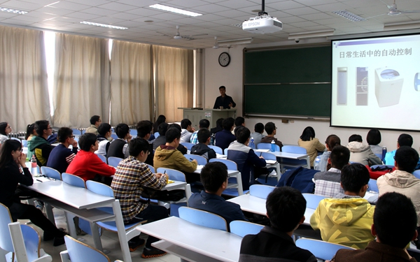 “人工控制,好比人运用眼睛、大脑、手进行控制操作。它们分别代表了变送器、控制器、执行器……”盛立在讲解人工控制过程。他简述开环、闭环控制等基础知识来加深学生们对自动控制理论的理解。自动控制离不开动手操作,盛立重点向学生们介绍了各专业对应的科技竞赛活动,并用几道典型赛题活跃学生们的思维。现场学生们抓住机会与老师积极互动,现场气氛活跃。