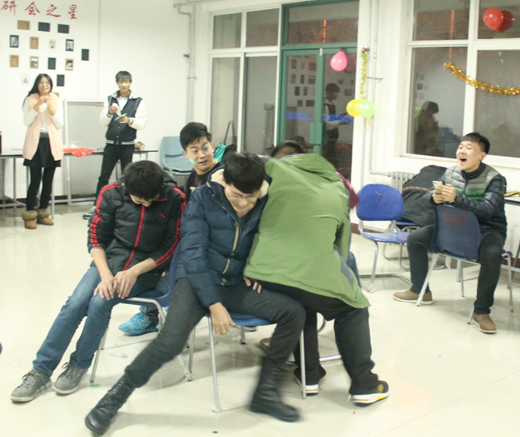 “一年一度的圣诞联欢会又来啦,今晚这里是我们的舞台,大家要好好玩啊!”陈怡然致辞并请出了联欢会主持人――圣诞老人夏仲仲。联欢会伊始,各成员将自己带来的圣诞礼物放在圣诞树下,共同唱响《Merry Christmas》,为联欢会拉开了序幕。在圣诞老人对联欢会游戏内容做了简单的介绍后,成员们迅速进入游戏状态,跃跃欲试。“抢椅子”的你争我抢,“衔纸杯传水”的默契配合,“顶气球”的互不相让・・・联欢会活跃愉快的气氛让每个人的脸上都挂满笑容。联欢会结束后,大家交换礼物,一起收拾现场后离开。