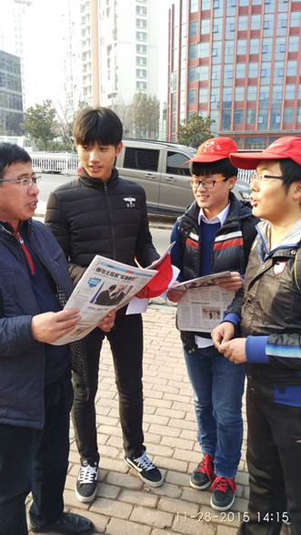 上午八点,学院2014级培训班学员在学校北门集合后,实学社负责人首先对活动要求进行了说明,并结合“12月2日交通安全日”的内容进行了安全教育,随后向各小组发放了身份标志和本次义卖的报纸。之后,学员分为六个小组分别前往家佳源商场周边的多个地段开展义卖活动,向过往的路人分发宣传资料,认真向他们介绍义卖活动,路人纷纷停下脚步,献出自己的爱心。本次义卖活动的三百份报纸便全部售罄,募集的爱心善款也全部捐助给学院“信・基金”。当天下午,2015级学员也顺利完成了爱心义卖的活动。