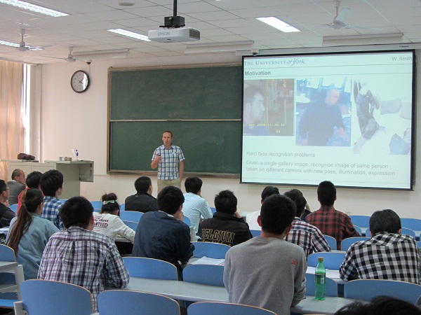 本次报告围绕计算机视觉和图形学方面的三维人脸分析的统计建模展开。重点讲解了五个方面的内容:人脸分析与建模,基于图像明暗亮度变换的阴影恢复技术,形变模型模拟的应用,全局和局部模型,生物物理模型。报告最后,威廉姆•史密斯博士与我院师生进行了进行了现场交流,就人脸分析建模中存在的一些问题进行了热烈的讨论,现场学术氛围浓厚。