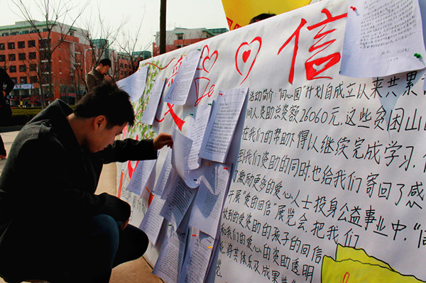 据悉,“同心圆”计划自成立以来累计资助学生107人,资助总金额达26060元。这些贫困山区的孩子在“同心圆”计划以及社会爱心人士的帮助下得以继续学业。为表达感激之情,孩子们寄回了自己写的感谢信,虽然感谢信的语言幼稚简单,但却表达了孩子们的真情实感。“同心圆”计划通过展览这些“爱的回信”,让更多的人了解贫困地区孩子生存和学习情况,鼓励人们发扬雷锋精神,支援贫困地区。