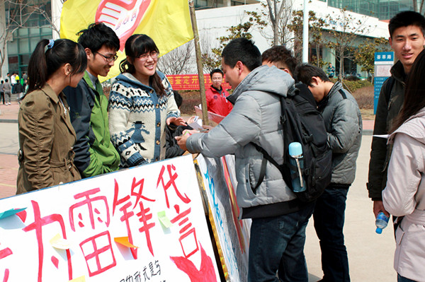 3月16号,我院“同心圆”计划在荟萃广场以展板和传单的形式,向同学们展示了其支教队在支教后期收到的来自支教地孩子们的来信,并向同学们宣传雷锋精神,鼓励同学们“为雷锋代言”。