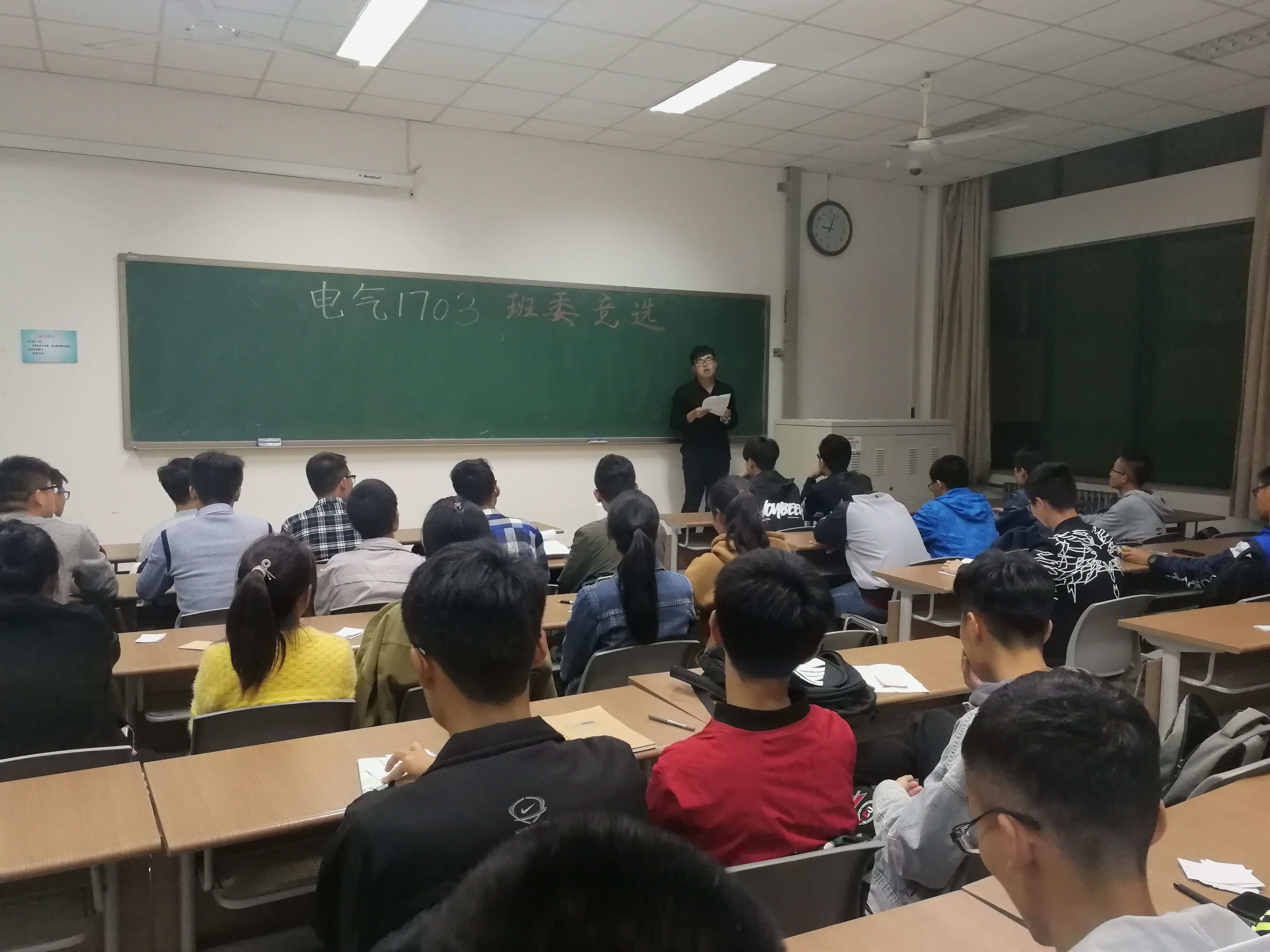 10月11日晚9点,电气1703班在南堂314室举行班委竞选活动,代理班主任付子祥及班级全体成员参加。
