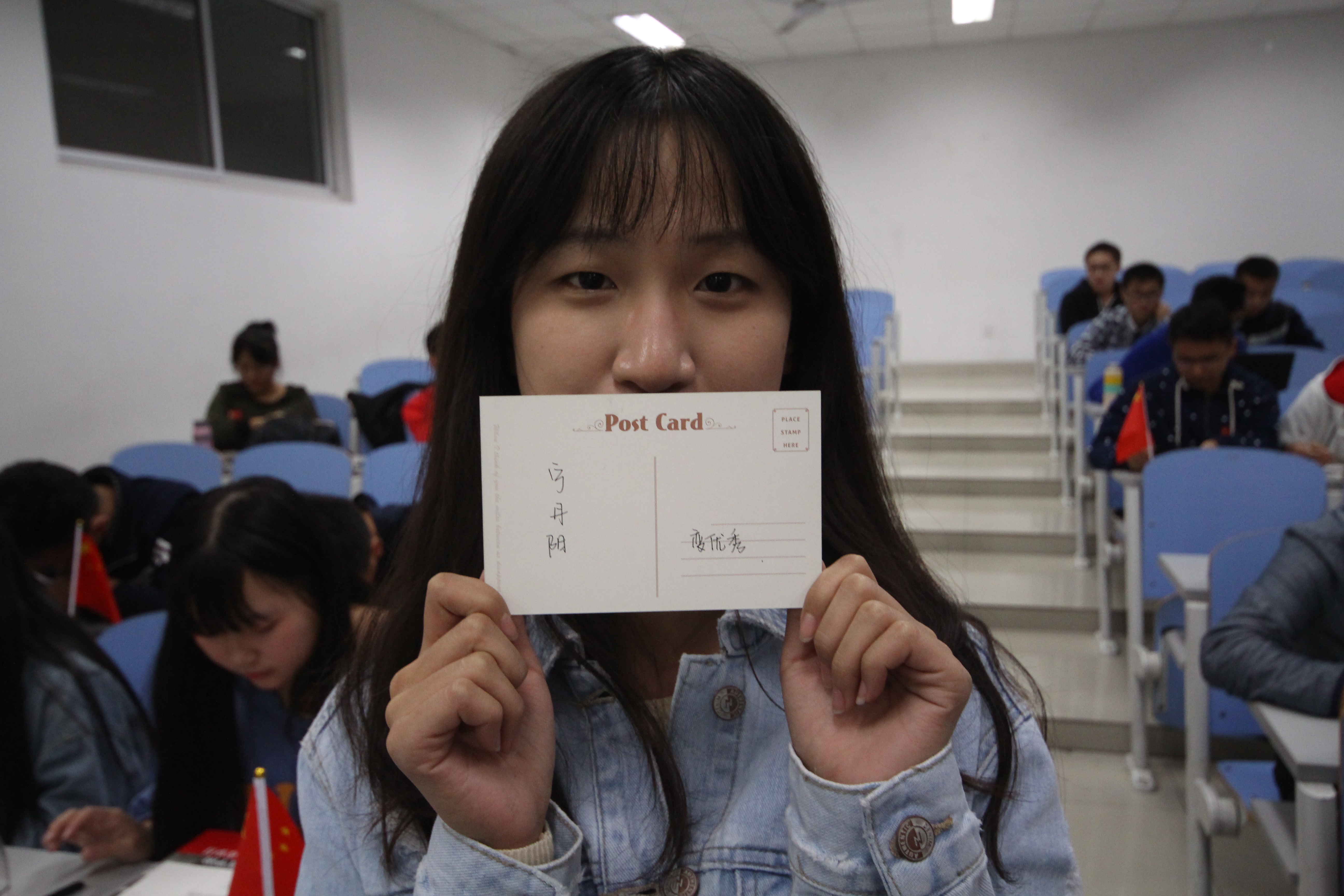 学生在明信片上书写对党和中国未来的美好期望(摄影:祁昊天)