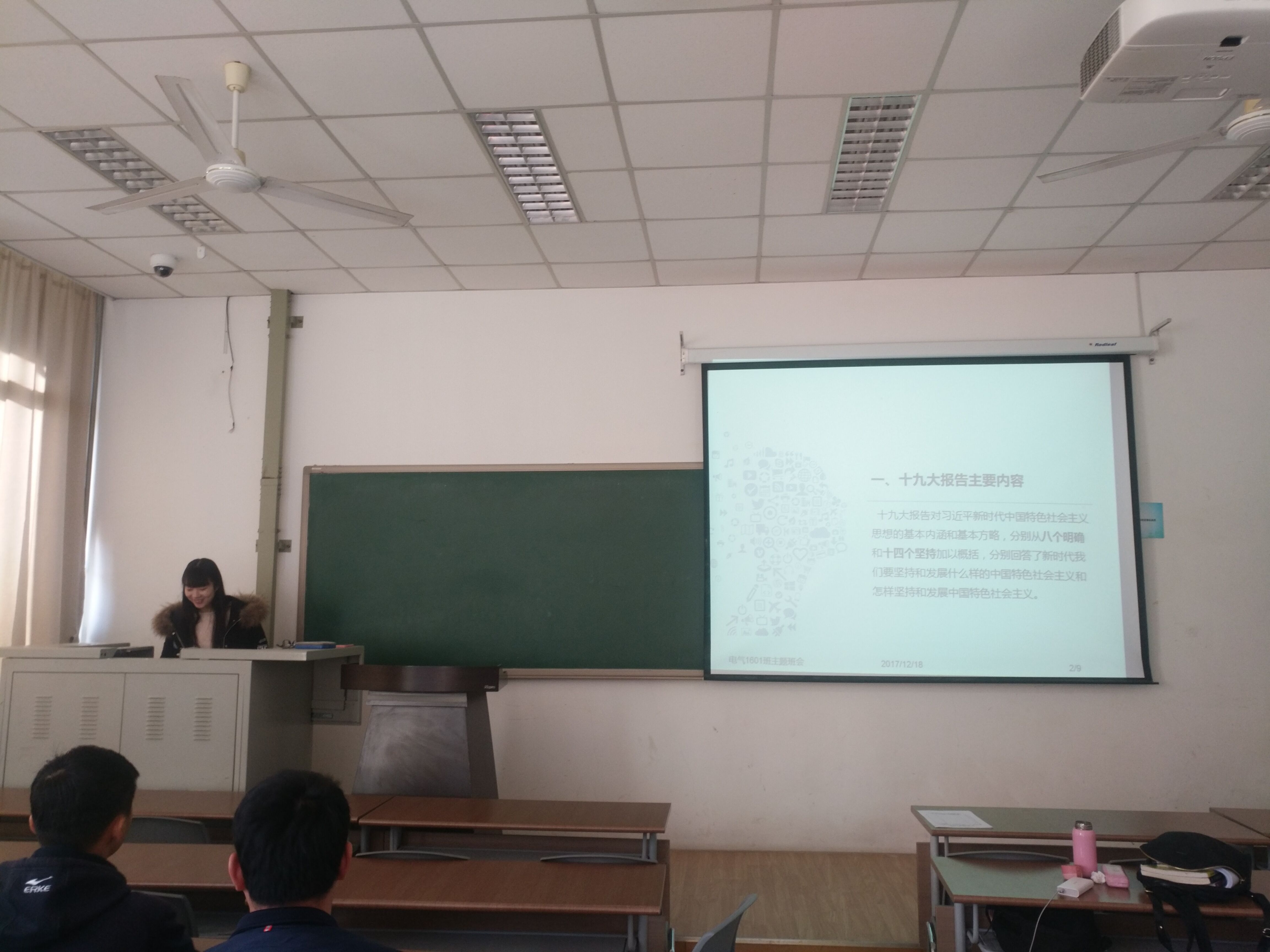 班会第一项,由韩颖斐带领学生们学习十九大报告并阅读文章《习近平:新时代的领路人》。之后,电气1601班学生们依次对自己的学习情况、卫生情况和班内活动参与情况进行陈述,最终由全体学生选举产生优秀团员。