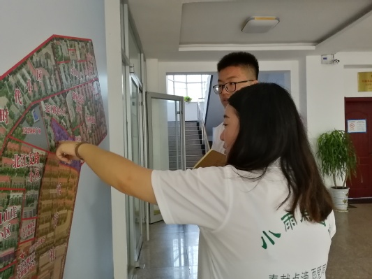 队员张天宇、刘凯旋重点负责此项任务,两人前往北江社区、正日山庄社区等地寻找合适地点,重点对几个小区的广场进行考查,并沿途向在广场的居民介绍本次维修活动,鼓励居民们带上家里损坏的家电到维修点进行维修。综合考虑用电等因素后,维修队与小雨点课堂联系,就维修时间地点及物资安排进行了商讨。最终确定了北江社区服务站附近设置维修站点。一是由于方便安排小雨点提供的桌椅并方便维修时用电,二是附近居民对服务站比较了解,对活动的宣传具有重大作用。