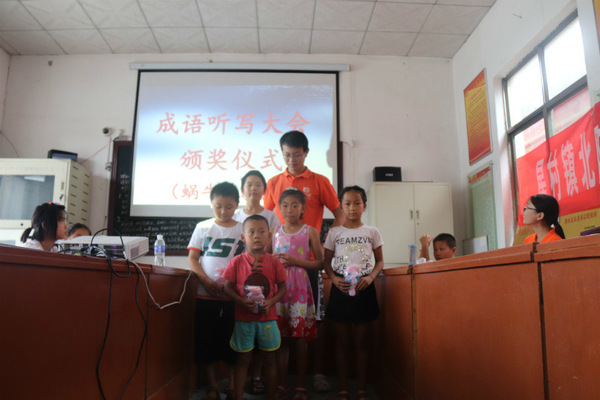 听写环节,由刘娜读出成语并解释成语所蕴含的意义,孩子们听完后在事先分发好的纸上写下成语。听写完毕,支教队队员根据孩子们的年龄及听写状况以百分制进行打分,同时选出获奖者,并由支教队队长管增嘉为获奖学生颁奖。最终,张明珠获得一等奖,潘静、冯文希、杜明龙获得二等奖,张佰振等五名学生获得三等奖,其余学生均获得参与奖。