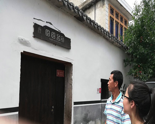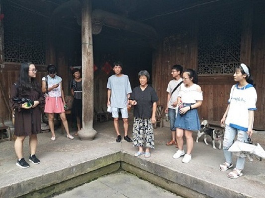 调研队走访的第二站便是高迁村。村委会委员应利琴首先向队员们介绍了高迁村的环境治理情况,走在大街上,成员们到处可以看到贴有垃圾分类回收的宣传标签和具有监督性质的垃圾投放点标示牌,然后带领实践队参观了以极其古色古香的慎德堂为主要代表的传统古村落建筑。当地极具声望的吴老师还亲自给调研小组讲解了古宅的文化内涵,例如:木窗上雕刻的八仙过海图画以及关于春夏秋冬诗句的微雕,而窗户两两相对,寓意春夏秋冬四季变换;庭院内鹅卵石的铺设也别出一格,最外一层是铜钱形状,象征荣华富贵,稍向内一层则是蝙蝠形象,象征福寿无疆,最里面则是一本大书,代表“万般皆下品,唯有读书高”,书的周围还有象征“书中自有颜如玉”的镜子图案,在东西南北四个方向上还有象征着福禄寿喜的金元宝、小鹿、寿桃以及石榴,甚至还有名为“紫气东来”的穿堂风等等。短短一个小时的参观,让调研小组的成员们深刻感受了高迁村厚重的文化底蕴,还有村民高度的垃圾分类回收意识,家家户户门前都十分干净整洁,使得村容与其厚重的文化底蕴十分相称。