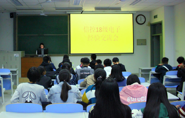 10月12日晚,信息与控制工程学院电子专业于南教212教室举办学习经验交流会。电子专业15级学生许燕、16级李寿杰、17级李永康分别就学习、科技创新方面进行了经验分享,活动电子1701班王怡宁主持,2018级电子专业全体学生参加。