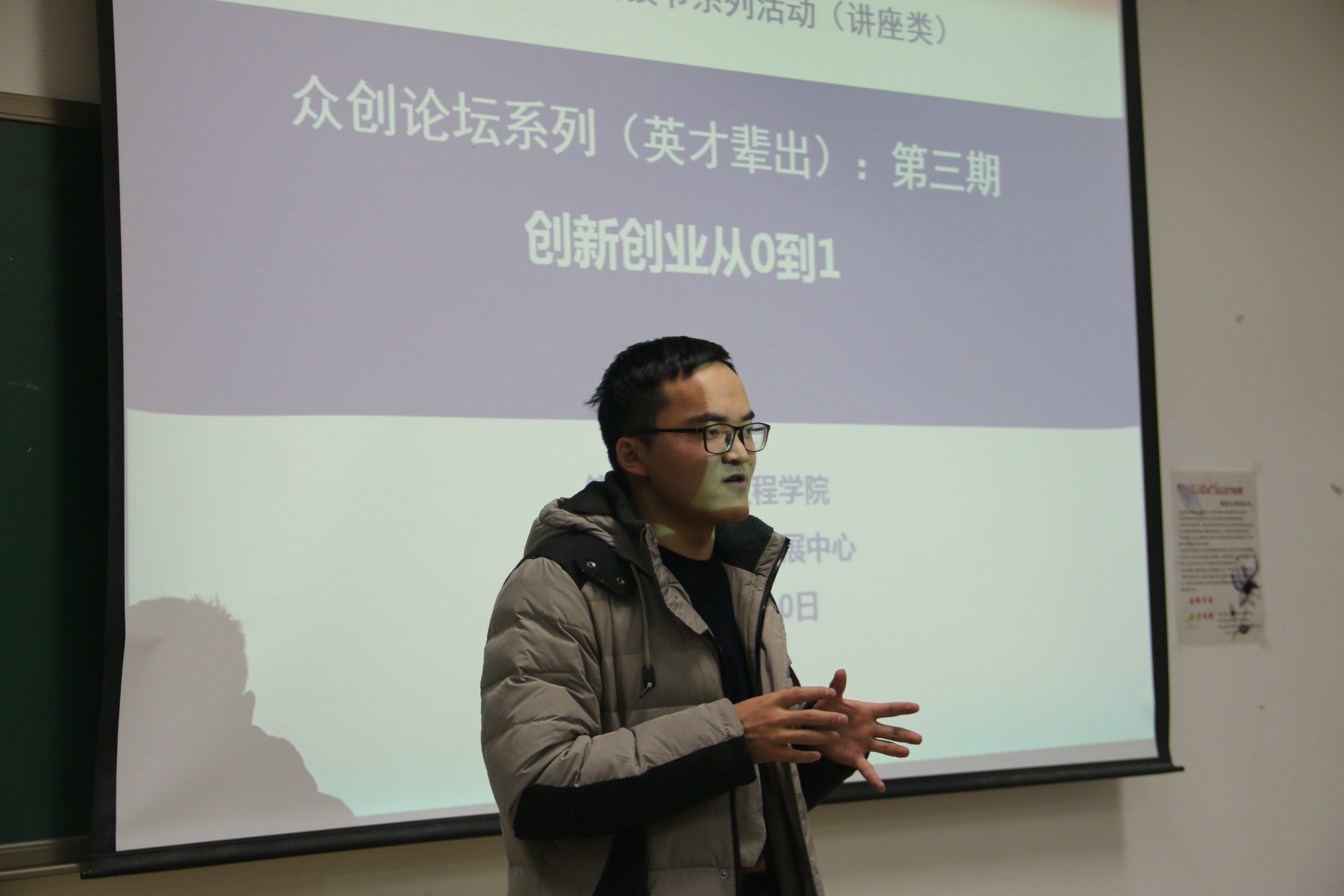 为鼓励和支持大学生积极参与创新创业活动,提高大学生的实践能力和创新创业能力,11月10日晚,信控学院于南教楼303教室开展第二十七届大学生科技节众创论坛(英才辈出)系列讲座第三期“创新创业从0到1”,本次讲座由信控学院15级学生王兴伟主持,全体2018年立项的大学生创新创业训练项目负责人到场参加。