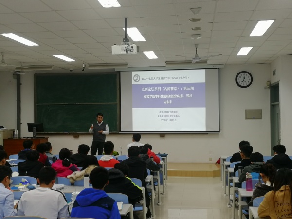 此次讲座,孟兆刚老师从之前任信控院辅导员工作说起,在管理创新创业工作方面分享了一些自己的经历和感悟,让学生们对创新创业有了更深的理解与认识。首先,孟老师带学生们回顾了信控学院创新创业的起源,向听众介绍了往届优秀的大创项目以及优秀学生代表对于创新创业赤诚的热情,让在场学生感受到了创新创业的魅力。然后,孟老师详细解读了ABC计划的初衷以及各个部分的内容,点明了信控院目前在创新创业方面的问题,如学生创新创业意识薄弱、目的功利化等,让学生充分意识到了目前创新创业工作存在的问题,明确了下一步工作方向。其次,孟老师向学生介绍了与信控院专业相关的挑战杯、互联网+等高水平竞赛的优秀项目,鼓励学生敢于创新,敢于挑战,敢为人先,提高自己表达能力,做一名“既能说也能干”的优秀信控学子。特别是在做人方面,孟老师告诫学生要懂礼仪、有礼貌,要尊重师长、尊重同学,最重要的是要淡泊名利、真抓实干,不以名利参加比赛,不“抱大腿”,以此真正提高自己的实力。最后,孟老师对在场学生们提出了殷切的希望,希望每个人都可以有一个充实精彩的大学生活,青出于蓝而胜于蓝。