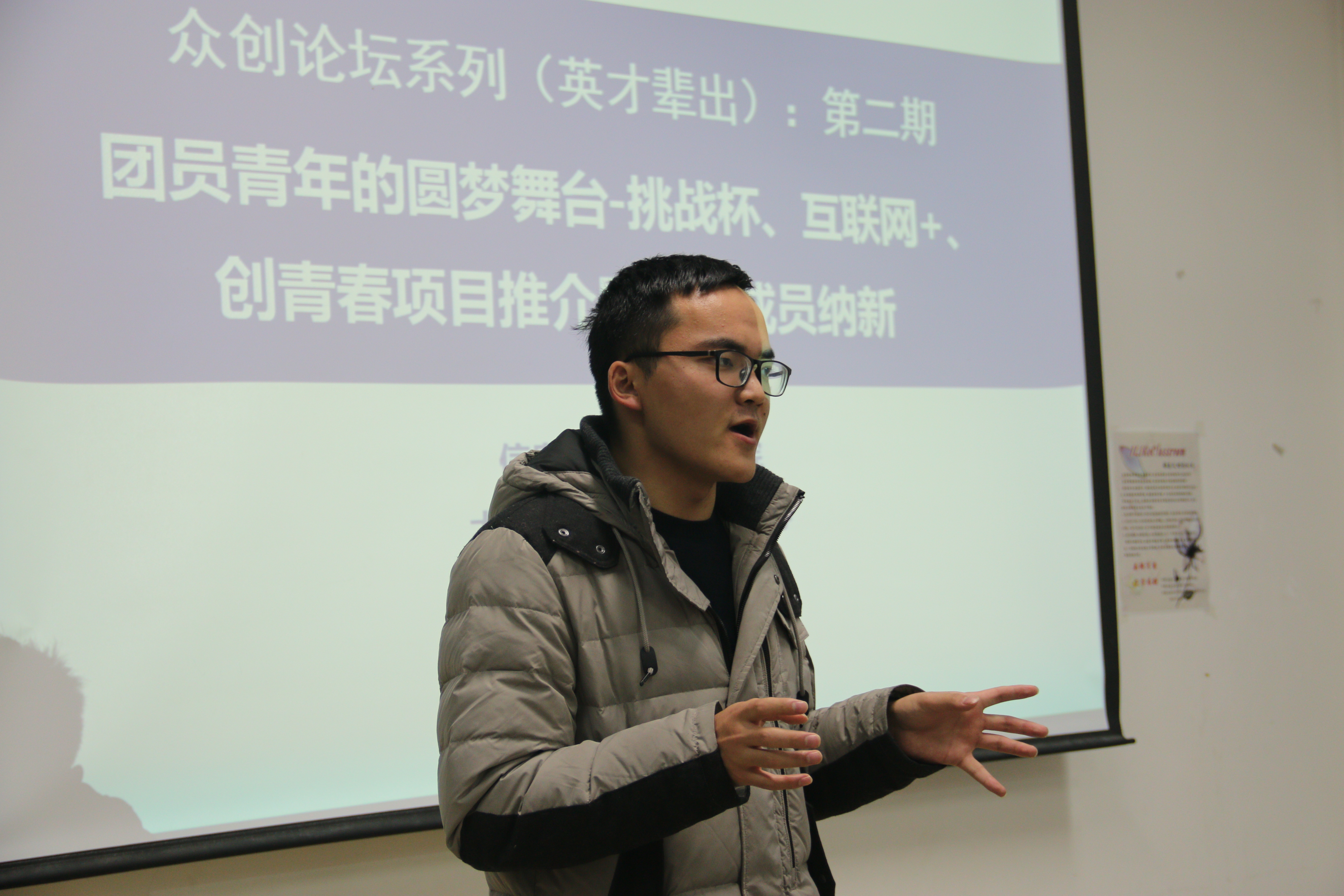 2018年11月26日晚上9时,由信息与控制工程学院组织的众创论坛(英才辈出)第二期(团员青年的圆梦舞台-挑战杯、互联网+、创青春项目推介暨骨干成员纳新)在南教107教室举办。本次纳新活动由自动化2015级学生王兴伟主讲。