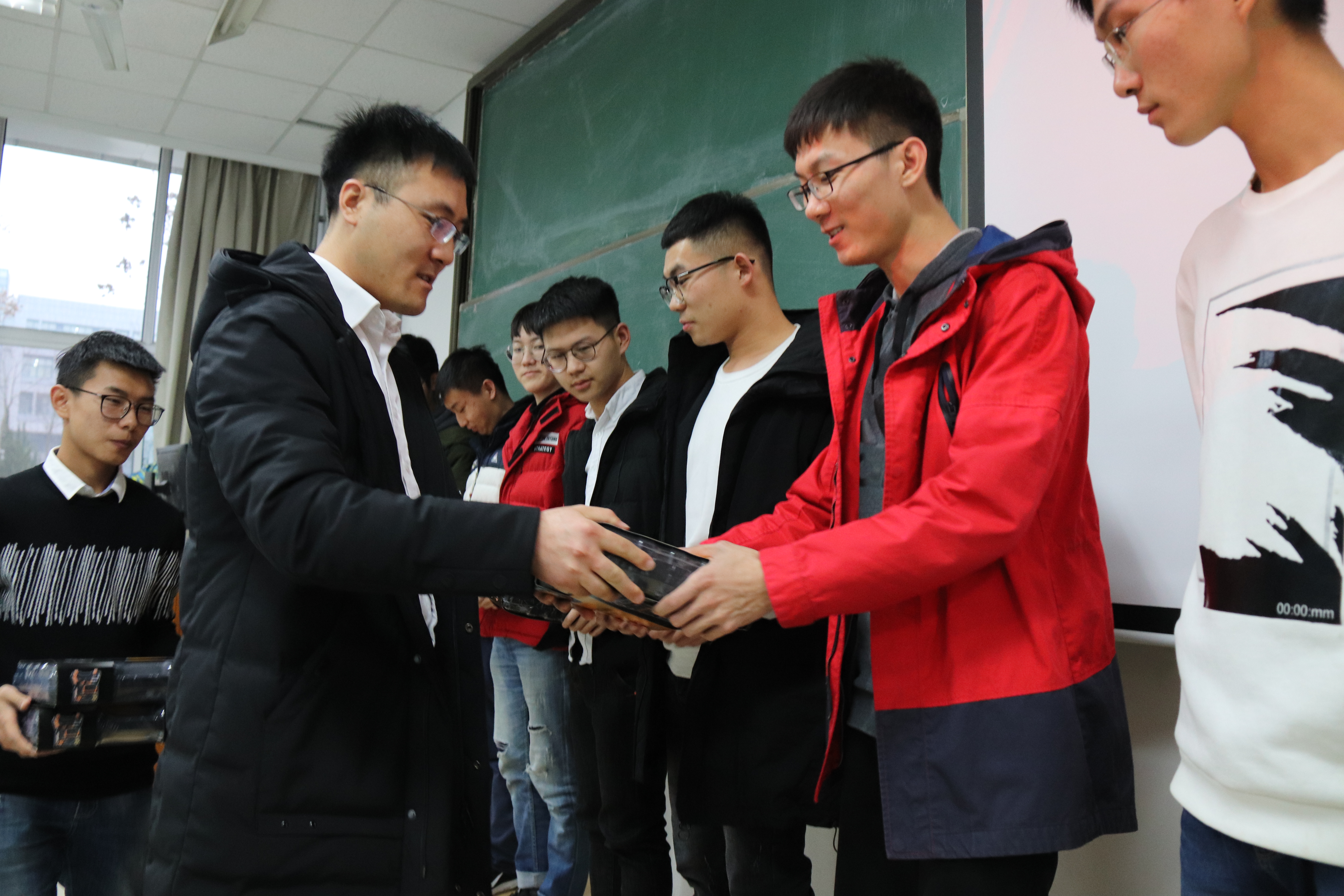 王远泽先介绍了本次电子设计竞赛的具体情况,包括竞赛题目,参赛人数,获奖情况等。本次竞赛成功参赛队伍占80%以上,获奖比例超过60%。他对本次获奖的同学表示衷心祝贺,并对大力支持竞赛的中自庆安公司表示感谢。科协负责老师蒋仁福为学生们讲述了一位因电赛收获成长并走上成功道路的校友的故事,并由此向18级学生们说:“一定要用于在国赛中闯一闯,哪怕闯不进国赛,哪怕闯入国赛却未得奖项,但在其中你收获的知识与经验一定是别人抢不走的。”蒋仁福亲自给获得特等奖的队伍颁奖,此次获得特等奖的队伍有魏文涛队、韩旭队、刘泽兰队、谭强队以及李师哲队。