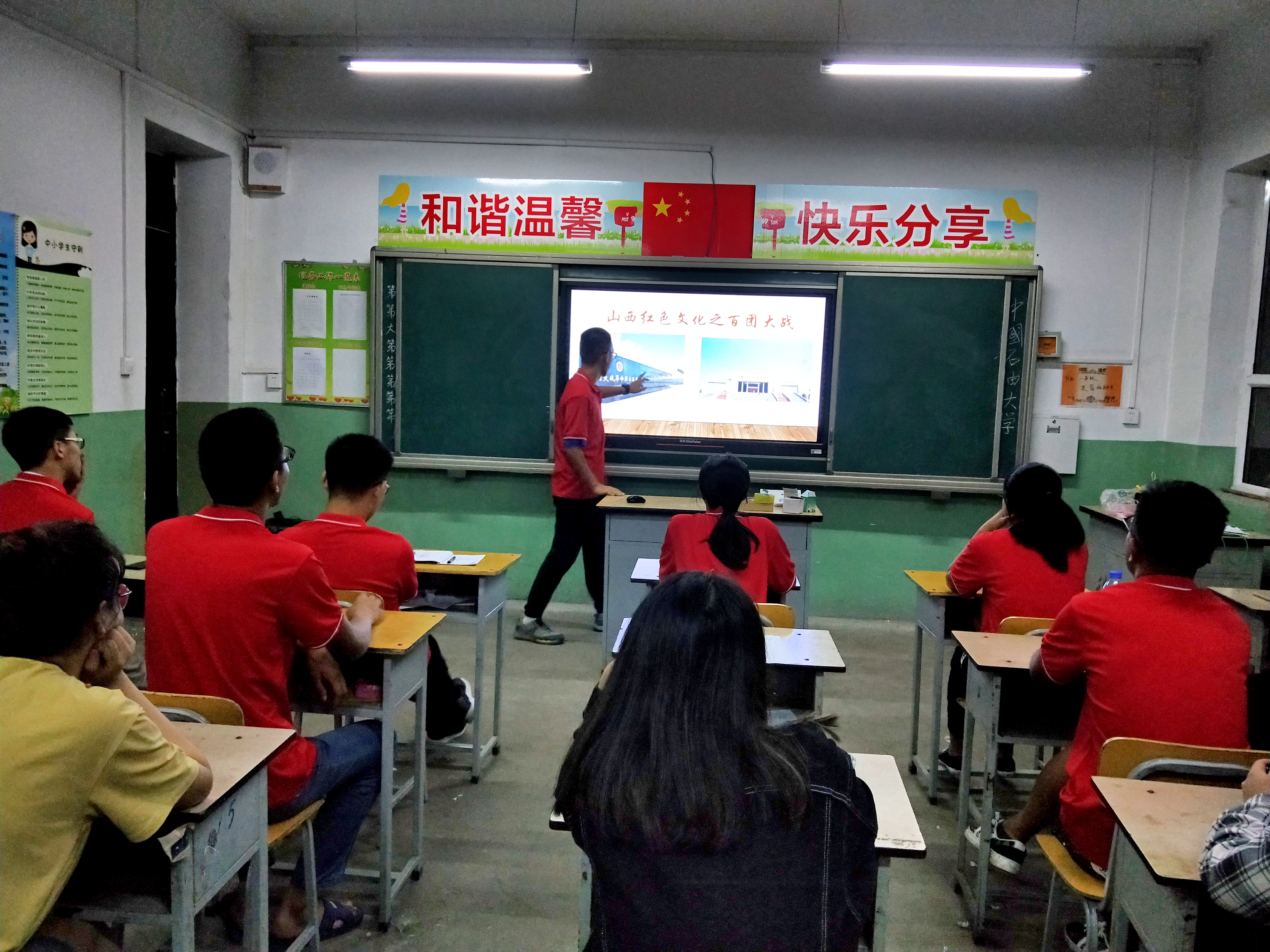 山西是具有光荣传统的革命老区,也是红色文化资源的重要聚集地。在山西分布着数千个革命遗址和纪念建筑物。为了让支教队成员们了解山西红色文化,学习山西红色精神,提高成员们的思想觉悟,中国石油大学(华东)麦子支教队为队内成员们设立了“红色山西”课堂。该课堂由山西本地的同学来讲解,通过山西同学们分享自己家乡的红色文化更能够让队员们感同身受,更加深入地感受山西的红色文化。