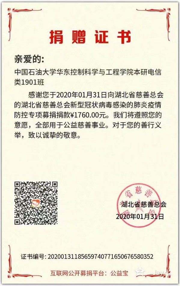 新型冠状病毒肺炎疫情牵动人心,据悉,1月31日,我院本研一体化(电气信息类)1901班自发组织募捐,向湖北省慈善总会新型冠状病毒肺炎疫情防控专项捐款1760元,收到来自湖北省慈善总会颁发的电子版“捐赠证书”,全班25人为疫情防控做出应有的贡献,众志成城,共同抗击疫情。