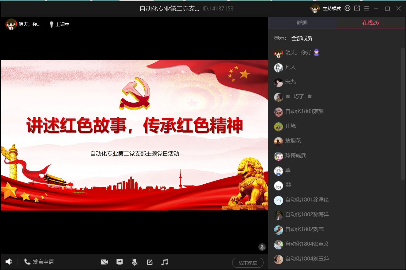 为加强红色基因教育,传承红色精神,我院自动化第二党支部于2020年4月24日下午4点在QQ会议上举行“讲述红色故事,传承红色精神”主题党日活动。活动由党支部书记高一鸣同志主持,全体正式党员、预备党员和入党积极分子参与此次活动。