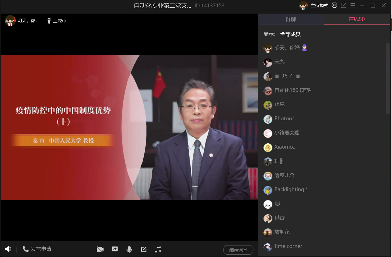 为深入学习贯彻党的十九届四中全会精神,把制度自信融入血脉、铸入灵魂,沿着中国特色社会主义道路奋勇前进,控制学院自动化第二党支部于2020年4月24日晚上8点在QQ会议上召开“制度自信融血脉铸灵魂”四中全会精神专题学习会。活动由党支部书记高一鸣同志主持,全体正式党员、预备党员和入党积极分子参与此次活动。