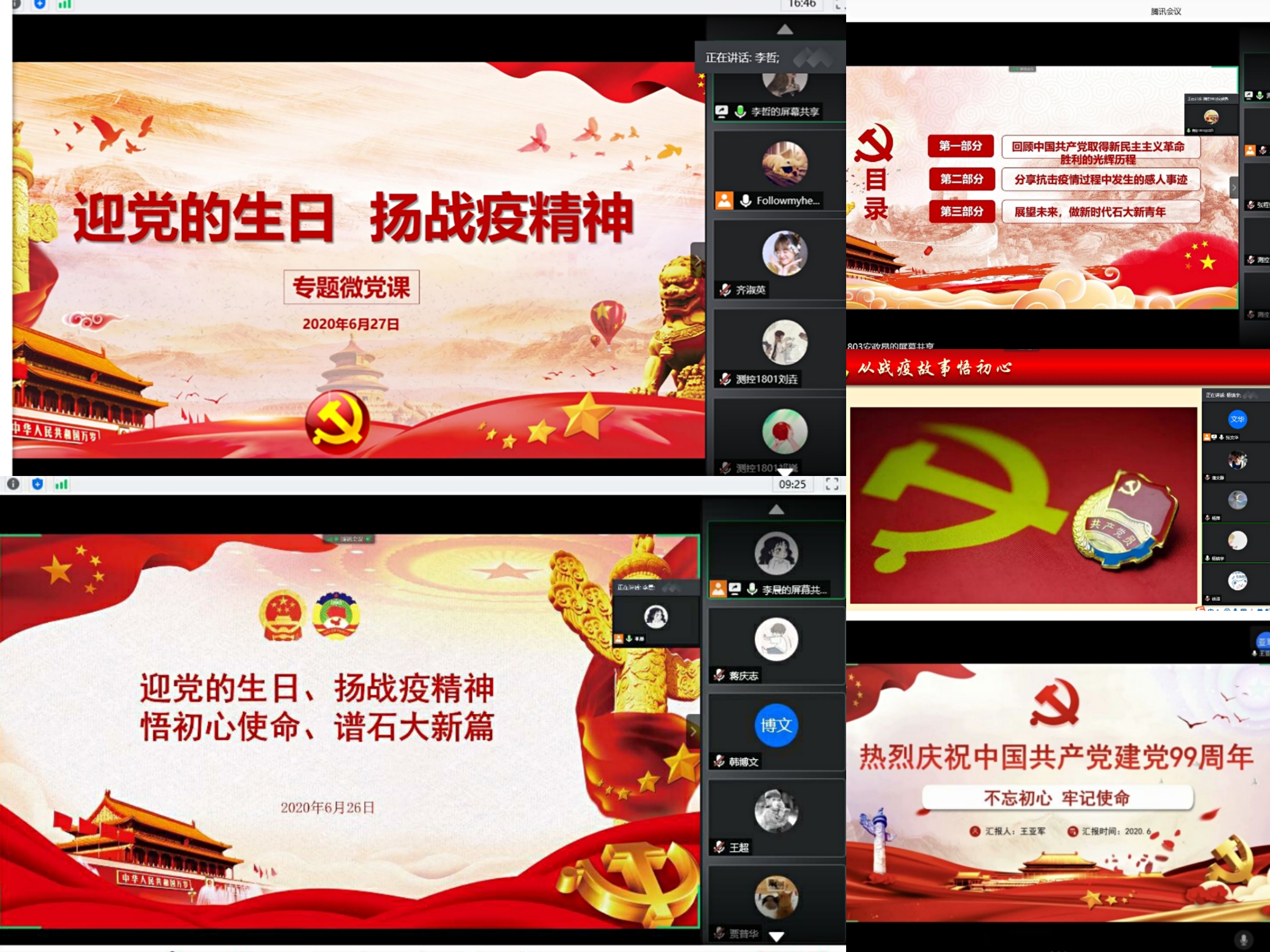 在“七一”建党节到来之际,为回顾党的光辉历程,发扬新冠疫情期间党员先锋模范作用,感悟入党初心使命,我院测控专业第二党支部于6月26日、27日分组在腾讯会议上开展“迎七一,悟初心”主题党日活动。各学习小组进行深刻学习与讨论,全体党员和部分入党积极分子参与此次活动。