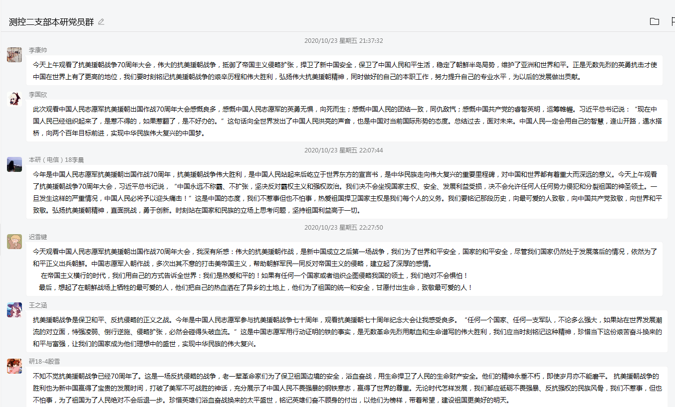 为了纪念中国人民志愿军抗美援朝出国作战70周年,铭记抗美援朝战争的艰辛历程和伟大胜利,弘扬伟大抗美援朝精神,我院测控第二党支部于10月23日,在工科E1329观看了纪念中国人民志愿军抗美援朝出国作战70周年大会直播,测控第二党支部全体成员参与此次会议。