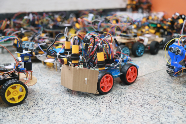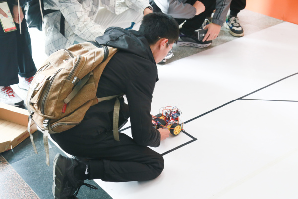 成果验收于早上八点正式开始,同学们陆续将做好的小车交于组委会检查,并按顺序排队等待上场地检验成果。组委会工作人员分工明确,计时、录像、记录测试项得分,有条不紊地对参赛作品进行验收。其中,“智能寻迹小车”题目的参赛选手均为大一新生,尽管对单片机知识了解尚浅,仍有许多参赛团队在短短半月完成成车制作和调试,实现寻迹功能。更有不少同学别出心裁,做出形状、大小各异的寻迹小车,为比赛增添了许多趣味性。由大二、大三学生为主要参赛选手的“智能避障避险小车”和“机器人灭火”题目相对难度较大,对参赛选手单片机知识及机器人各模块联动的能力要求更高。“代码的逻辑是遇到的最大问题,我们通过模拟通过赛道的过程对代码进行不断修改。”参赛选手徐晓阳这样说道。