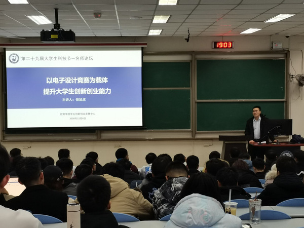 为营造良好的创新创业文化氛围,激发在校大学生的科技创新热情,提高大学生的科技创新能力。12月7日晚,我院在东环301举办的“以电子设计竞赛为载体,提升大学生创新创业能力”为主题的名师讲坛活动。海空学院副教授、我校电子设计竞赛负责人任旭虎老师做客讲坛,活动由学院学生创新创业发展中心指导老师蒋仁福主持。