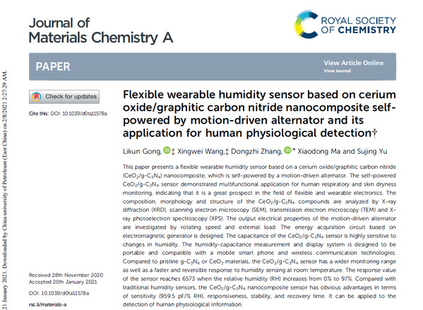 【本站讯】近日,我校理学院理科实验班专业2017级本科生宫礼坤的科研成果《运动驱动交流发电机自供电氧化铈/石墨氮化碳纳米复合材料柔性可穿戴湿度传感器及其在人体生理检测中的应用》(Flexible wearable humidity sensor based on cerium oxide/graphitic carbon nitride nanocomposite self-powered by motion-driven alternator and its application for human physiological detection)在线发表在国际知名权威期刊Journal of Materials Chemistry A (SCI影响因子11.301)上。论文是宫礼坤和yL23411永利集团控制科学与工程专业2019级研究生王兴伟共同第一作者,通讯作者是yL23411永利集团张冬至教授,yl23411集团为第一署名单位。该研究得到国家自然科学基金、研究生创新工程基金项目资助。