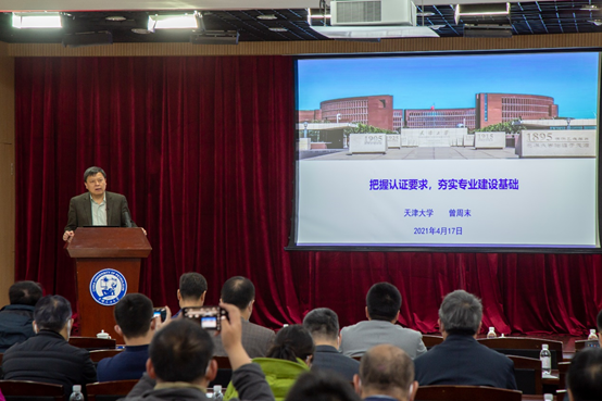 报告会上,曾周末教授作了题为《把握认证要求,夯实专业建设基础》的专题报告。他围绕工程教育专业认证的新形势新要求,重点阐述了如何在专业建设过程中落实“成果导向”的认证理念,一是要明确培养目标,培养目标要符合毕业生表现、社会需求、专业条件和特质,要可把握,切忌口号、标语、空洞无物;二是要通过细化考察要素、明确培养载体、关注达成评价等方面细化毕业要求;三是要通过关注体系设计、关注责任落实、关注课程目标达成等方面落实教学责任;四是通过成果设计、成果评价、评价结果利用等三重点一机制来坚持持续改进。曾教授还强调,专业要从“明确3类目标”、“明晰3层关系”、“落实4种评价”、“构建一套机制”等方面的底线思维加强建设。