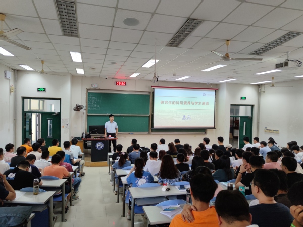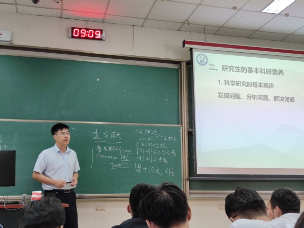 首先,盛立副院长对学院的基本情况进行了简要的介绍,包括学院的发展历程、学位点建设情况等。然后,他从研究生的基本科研素养出发,向同学们介绍了在科研中如何发现问题、分析问题、解决问题,并讲解了论文撰写、论文投稿、论文修改等三个环节。他鼓励每位新同学要尽快完成从本科生身份到研究生身份的角色转变,积极主动的与导师进行沟通,实现从学习到创新,被动到主动,个人到团体的转变。最后,盛立副院长重点强调了研究生基本学术道德,他要求每位研究生都必须严守学术道德红线,绝不允许出现抄袭、一稿多投、伪造数据等行为。
