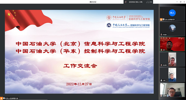 为提升学生工作水平,12月27日,控制学院应邀同中国石油大学(北京)信息科学与工程学院开展学生工作线上交流,分享特色工作思路,交流工作经验。中国石油大学(北京)信息学院党委副书记于迎辉,全体辅导员与控制学院党委副书记赵小明,全体辅导员参加会议。