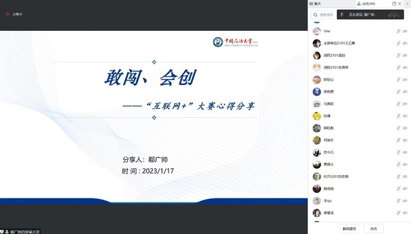 在会议上,闫学哲老师和郗广帅同学为大家详细介绍了“三大赛”的具体细节和比赛流程,鼓励同学们积极参与,希望大家在比赛过程中大胆尝试并不断突破自我,展现创新创业思维;在动手实践和团队合作的同时融入丰富的想象力,提高自身各个方面的能力,通过此次竞赛培养石大学生执着专注,开拓创新的工匠精神。