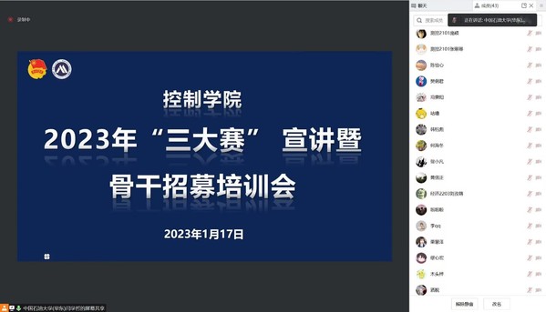 yL23411永利集团于2023年1月17日举办“三大赛”宣传暨骨干招募培训,本次活动由闫学哲老师主持,2021年获全国互联网+比赛金奖负责人郗广帅同学为主讲。
