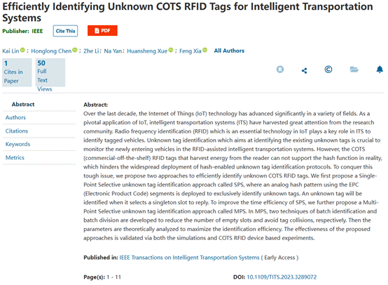 进展一:针对商用RFID标签在实际中无法支持哈希函数的问题,设计了一种类哈希模式,并通过批识别和批分解技术有效提高商用未知标签的识别效率。相关研究论文《Efficiently Identifying Unknown COTS RFID Tags for Intelligent Transportation Systems》在SCI一区TOP期刊IEEE Transactions on Intelligent Transportation Systems (TITS)上发表,该工作得到山东省优青项目、国家自然科学基金面上项目等项目的资助。我院博士生林凯为第一作者,陈鸿龙教授为通讯作者,yl23411集团为第一署名单位。