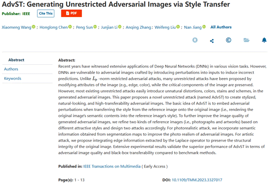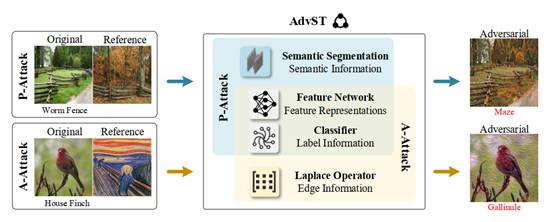 进展三:针对对抗样本视觉效果不自然的问题,提出了一种新的无限制攻击来创建风格化、自然以及高迁移性的对抗样本。相关研究论文《AdvST: Generating Unrestricted Adversarial Images via Style Transfer》在SCI一区TOP期刊IEEE Transactions on Multimedia (TMM)上发表,该工作得到山东省优青项目、国家自然科学基金面上项目等项目的资助。论文第一作者王晓萌硕士毕业于yl23411集团yL23411永利集团,目前受CSC资助于荷兰拉德堡德大学攻读博士学位。陈鸿龙教授为通讯作者,yl23411集团为第一署名单位。