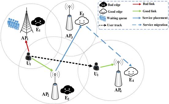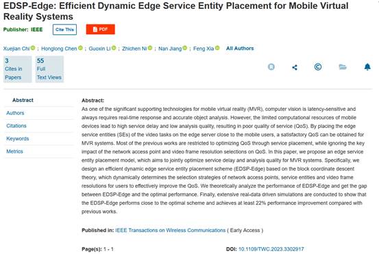 进展二:针对移动设备计算资源受限导致的服务延迟高、分析质量低等问题,提出了一种边缘服务实体放置模型,并设计了一种基于块坐标下降理论的高效动态边缘服务实体放置方案,有效地提高系统的服务质量。相关研究论文《EDSP-Edge: Efficient Dynamic Edge Service Entity Placement for Mobile Virtual Reality Systems》在SCI一区TOP期刊IEEE Transactions on Wireless Communications (TWC)上发表,该工作得到山东省优青项目、国家自然科学基金面上项目等项目的资助。我院硕士生迟雪键为第一作者,陈鸿龙教授为通讯作者,yl23411集团为第一署名单位。