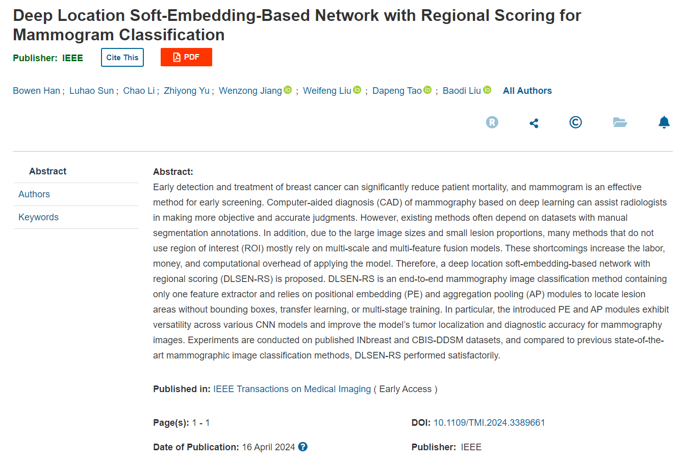 近日,我院刘伟锋教授团队在乳腺癌钼靶图像分类方面取得新进展,相关研究论文《Deep Location Soft-Embedding-Based Network with Regional Scoring for Mammogram Classification》在医学成像领域国际顶级期刊IEEE Transactions on Medical Imaging (IEEE TMI)上发表,该工作是与山东省肿瘤医院乳腺科合作完成,是人工智能与乳腺癌诊断的结合。我院刘宝弟副教授为通讯作者,2018级本研生韩博文和山东肿瘤医院2021级研究生孙芦浩为共同第一作者,yl23411集团为第一署名单位。