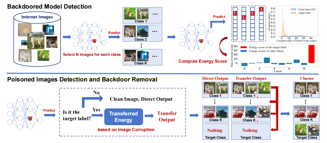 该工作针对现有后门攻击防御很少同时关注后门检测与后门移除的问题,提出了两种能量驱动的后门防御方法(Energy-based Backdoor Defense) , EBBA和EBBA+,可以在低成本的情况下实现后门模型的检测和后门的移除。主要有两个方面的贡献:首先,证明了预定义的目标标签更有可能出现在各种样本的前几个结果中, 并依此开发了一种增强的基于能量的技术,称为EBBA,以在没有特定任务样本的情况下检测后门模型。其次,在理论上证明了数据损坏后,受污染样本的原始干净标签更有可能被模型预测为最可能输出。因此,提出EBBA+,一种新的转移能量方法,可以高效地检测污染图像并在不进行模型重新训练的情况下移除后门。所提出的方法可迁移至语音与文本领域。