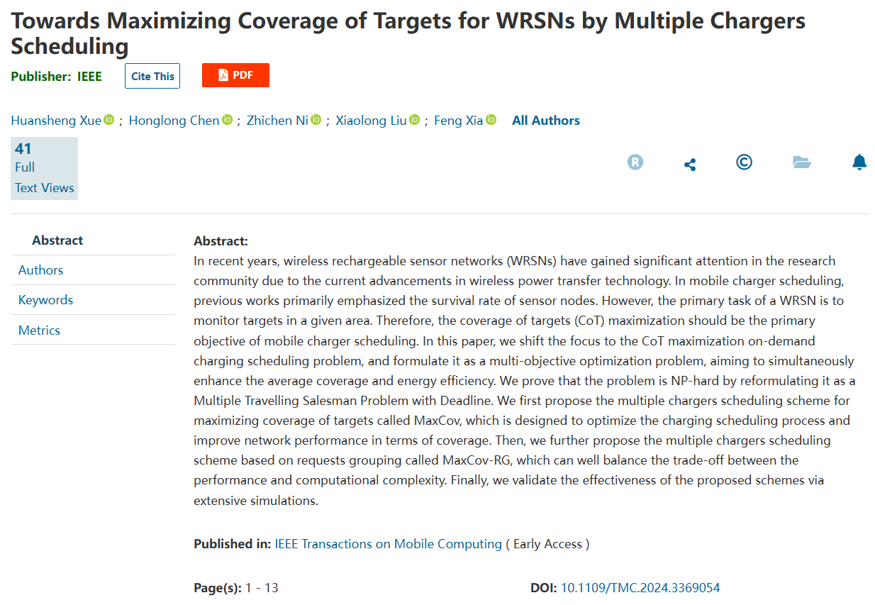 图 2. 《Towards Maximizing Coverage of Targets for WRSNs by Multiple Chargers Scheduling》论文首页图