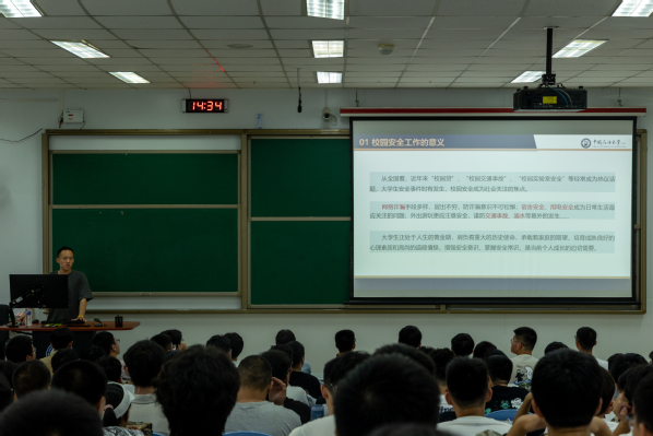 会议伊始,齐志伟老师对新生的到来表示热烈的欢迎,并简要介绍了两位辅导员的教育背景和工作经历。随后他强调了校园安全的重要性,提醒新生们要提高防诈骗意识,注意宿舍安全和个人财物保护。他特别指出,网络诈骗手段日益翻新,新生们应时刻保持警惕,避免上当受骗。