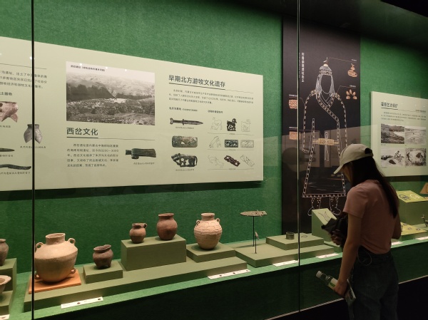 首先,我们参观了内蒙古黄河流域古代文明展,黄河从草原上流过,华夏文明也在草原之中孕育。整个展览的主题主要以时间为线,突出了内蒙古黄河流域的开发和治理以及民族融合、文化交流和文明互鉴三个主题,展示了从黄河文化到五四精神的延续。