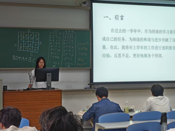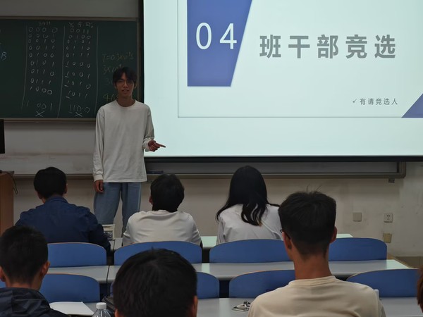 班会进入第三环节,现任班干部们依次上台进行述职,汇报了过去学期的工作成果,包括组织的活动、班级管理的改进措施以及个人的感悟与反思。最后,班会迎来了班干部竞选环节。竞选者们充满激情地阐述了自己的竞选理由、工作计划和对班级未来的展望。