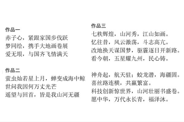 本次活动旨在通过线上平台,让同学们的文学才华和家国情怀得以充分展示。在作品征集阶段,同学们积极参与,用三行诗形式表达了对青春的热爱、对祖国的祝福以及对未来的憧憬。经过我院学生会工作人员严谨细致的筛选,从270余篇参赛作品中脱颖而出了6篇一等奖作品、15篇二等奖作品和30篇三等奖作品。比如“萤虫灿若星上月,蝉变成海中鲸/世问我因何万丈光芒/遥望与回首,皆是我山河无疆。”“七秩辉煌,山河秀,江山如画/忆往昔,风云激荡,斗志高亢。”这些作品不仅展现了石大学子青春的蓬勃朝气和积极向上的精神风貌,更传递了对祖国繁荣昌盛的坚定信念和美好祝愿,为庆祝祖国华诞75周年献上了一份特别的礼物。