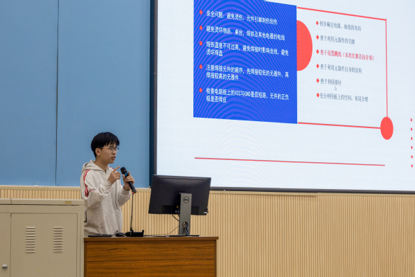 首先,双创中心主席贾洪贺同学为大家介绍本次电子设计竞赛的详细流程,并针对参赛队伍代表开展焊接专题培训。培训内容丰富,从焊接工具、材料介绍,到焊接具体步骤,再到注意事项,深入浅出、简明扼要,让同学们对焊接要点有了更清晰的认识。
