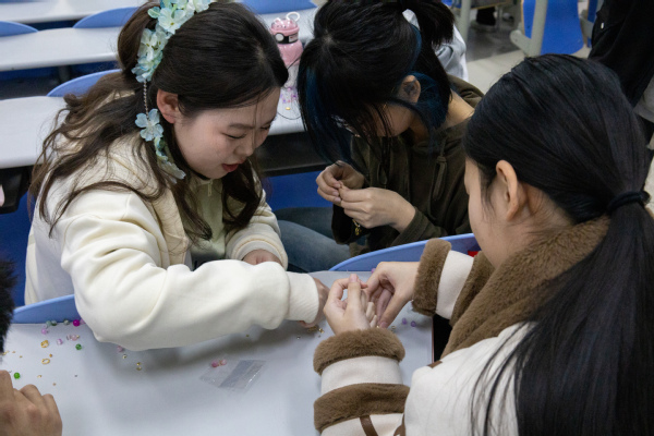 活动现场,气氛热烈非凡。同学们到场后,便被丰富的手工材料吸引。工作人员热情介绍材料特性与用法,大家迅速投入手链制作。制作过程中,同学们创意十足,有人用珍珠做出优雅手链;有人用彩色串珠编出充满童趣的作品。工作人员全程协助,并为完成的作品拍照。活动结束后,同学们带走亲手制作的手链,留作纪念。