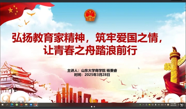 山东大学商学院杨秉睿同学,以“弘扬教育家精神,筑牢爱国之情,让青春之舟踏浪前行”为主题,生动讲述山大老校长潘承洞的生平事迹,带领大家学习潘承洞先生的教育家精神。他指出,潘承洞先生为数学、教育事业奉献自己的一生,这激励着广大青年树立理想主义追求,培养吃苦耐劳和守正创新精神,在这个科技创新的黄金时代,将个人理想融入国家发展大局,用青春的创造活力点燃科技强国梦想,在实现中国式现代化的壮阔征程中书写属于当代青年的璀璨篇章。