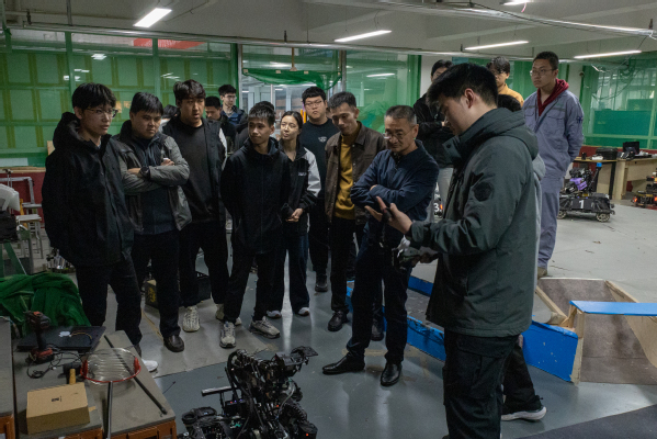 4月11日,刘昂峰董事长一行回访学院,首先前往充满活力与创新气息的Robomaster战队。在参观过程中,同学们详细介绍了参赛机器人的设计理念、技术创新点以及备赛情况。刘昂峰先生对同学们的创新精神和扎实的专业技能给予高度评价。