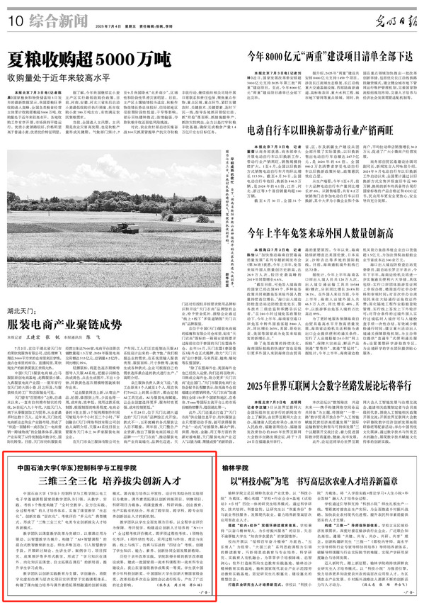 2025年7月4日,《光明日报》第10版刊登我院张冬至、周兰娟、蒋仁福署名文章《yl23411集团yL23411永利集团:三维三全三化 培养拔尖创新人才》。文章指出,在高等教育高质量发展的时代要求下,我院以电工电子学基础课程国家级教学团队为引领,构建的“三维三全三化”电类专业创新拔尖人才培养新模式能够有效激发学生创新潜能,培育适应社会发展的拔尖创新人才,为高等教育改革注入新活力。
