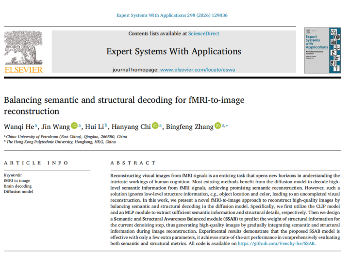 近日,我院控制工程专业2023级硕士研究生何万奇在脑信号视觉信息解码方面取得进展,相关研究成果Balancing semantic and structural decoding for fMRI-to-image reconstruction发表在《ESWA》。《ESWA》是人工智能与工程交叉领域的国际知名期刊,目前影响因子为7.5SCI一区Top。论文第一作者为何万奇,通讯作者为张冰峰副教授,yl23411集团为第一名单位和通讯单位香港理工大学为第二署名单位和通讯单位,该研究得到山东省自然科学基金,国家自然科学基金以及山东省泰山学者工程的资助支持。