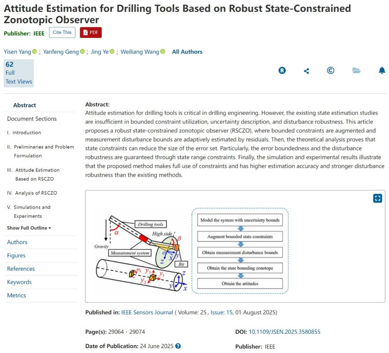 近日,我院控制理论与控制工程专业博士研究生杨毅森在钻井工具姿态估计方面取得进展,相关研究成果《Attitude Estimation for Drilling Tools Based on Robust State-Constrained Zonotopic Observer》发表在《IEEE Sensors Journal》。《IEEE Sensors Journal》是仪器仪表领域的国际知名期刊,目前影响因子为4.5SCI三区)。论文第一作者为博士生杨毅森,通讯作者为耿艳峰教授,yl23411集团为唯一署名单位和通讯单位,该研究得到国家自然科学基金重点项目、山东省重点研发计划项目等项目的资助支持。